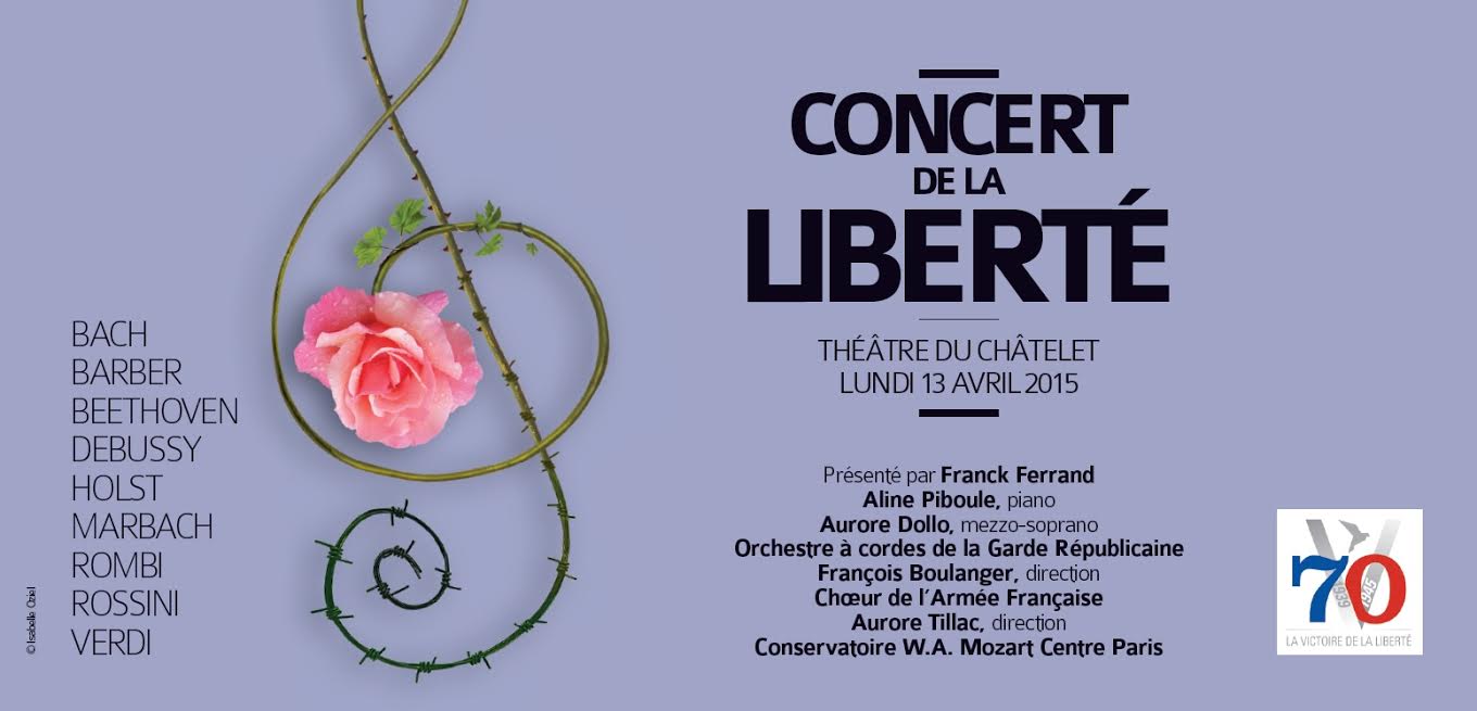 La Fondation pour la mémoire de la déportation organise le lundi 13 avril 2015, à 20 heures, le Concert de la Liberté, au Théâtre du Châtelet, avec le concours de l’orchestre à cordes de la Garde républicaine, du Chœur de l’Armée française et du Conservatoire du Centre W.A.Mozart de Paris.