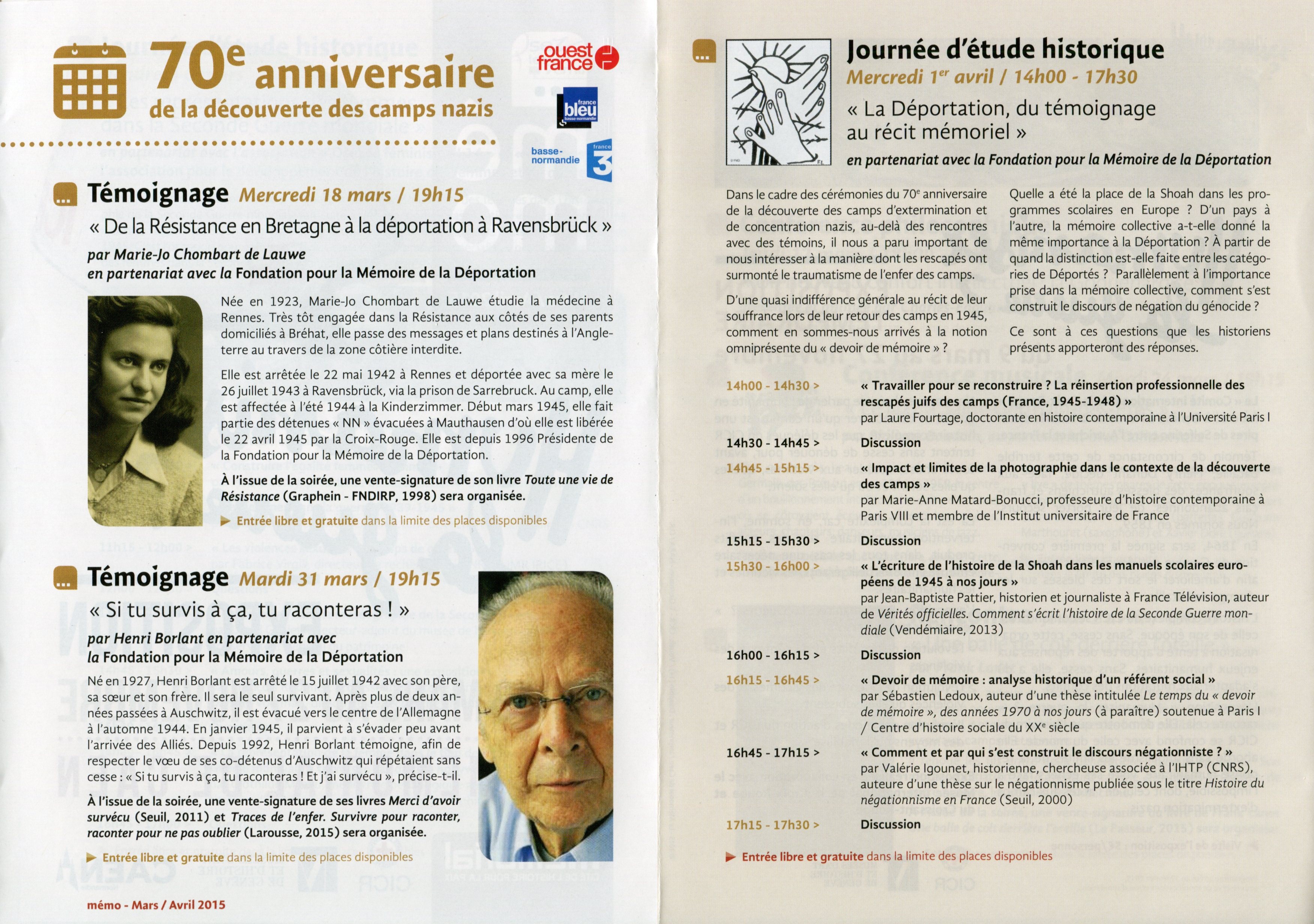 Dans le cadre des cérémonies du 70e anniversaire de la découverte des camps d’extermination et de concentration nazis, au-delà des rencontres avec des témoins, il nous a paru important de nous intéresser à la manière dont les rescapés ont surmonté le traumatisme de l’enfer des camps. Ainsi que la façon dont a été perçu, au fil des soixante dix années écoulées, le témoignage des Déportés. D’une quasi indifférence générale au récit de leur souffrance lors de leur retour des camps en 1945, comment en sommes-nous arrivés à la notion omniprésente du « devoir de mémoire » ? Quelle a été la place de la Shoah dans les programmes scolaires en Europe ? D’un pays à l’autre, la mémoire collective a-t-elle donné la même importance à la Déportation ? A partir de quand la distinction est-elle faite entre les catégories de Déportés ? Parallèlement à l’importance prise dans la mémoire collective, comment s’est construit le discours de négation du génocide ? Ce sont à ces questions que les historiens présents apporteront des réponses.
