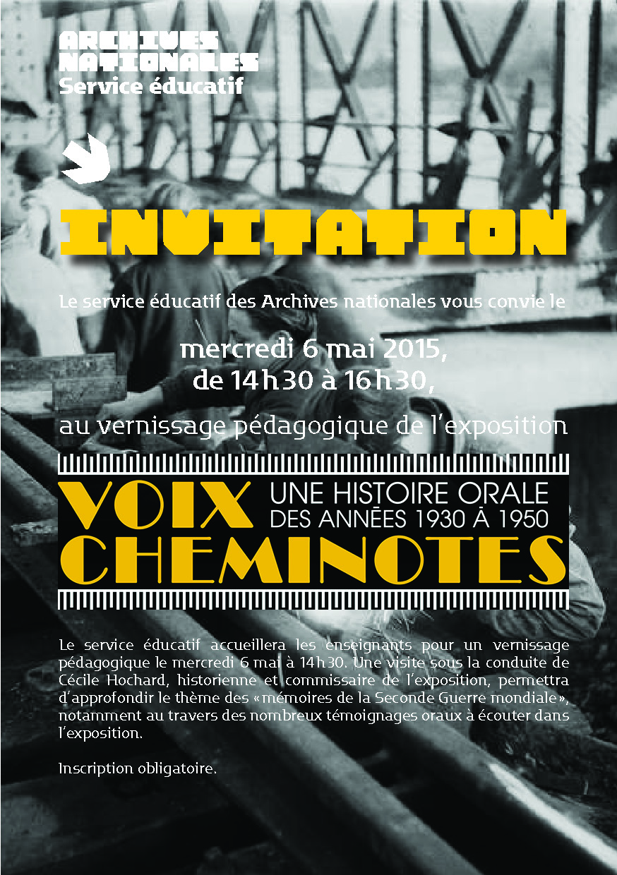 Les Archives nationales vous invitent au vernissage pédagogique de l’exposition sonore « Voix cheminotes: une histoire orale des années 1930 à 1950 ». Sous la conduite de son commissaire, les participants découvriront la collecte, la conservation et le traitement des témoignages oraux. A partir de ces archives, produites avec les employés de la SNCF, seront éclairés les enjeux relatifs à l’histoire et à la mémoire de la Seconde Guerre mondiale.