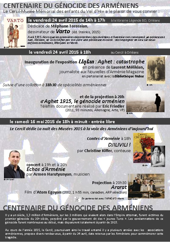 Au cours de l’année 2015, le Cercil, poursuivant ainsi le travail entamé il y a plusieurs années avec les associations arméniennes, propose divers rendez-vous à partir du 24 avril, date retenue par les Arméniens pour commémorer cette