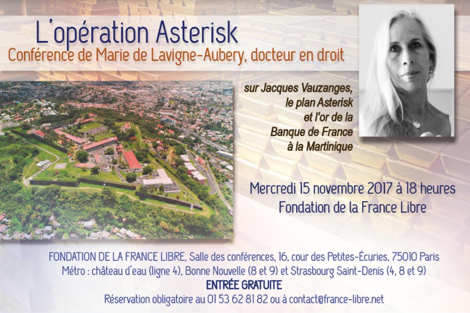 La Fondation de la France Libre organise mercredi 15 novembre, à 18 heures, une conférence consacrée à « l’opération Asterisk ». Nous aurons Marie de Lavigne-Auberyle plaisir d’écouter Mme. Marie de Lavigne-Aubery, docteur en droit et conférencière.