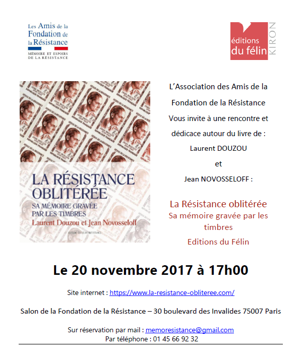 Rappel | Rencontre-Dédicace autour du livre de Laurent Douzou et de Jean Novosseloff : La Résistance oblitérée – Sa mémoire gravée par les timbres – 20 novembre à la Fondation de la Résistance