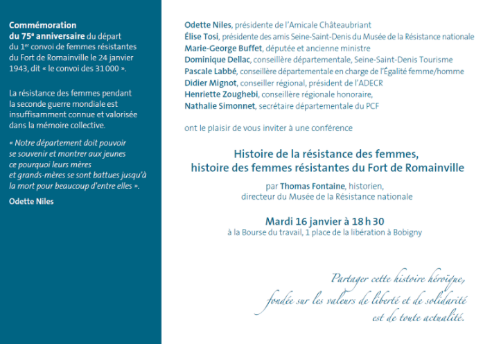 Conférence | « Historie de la Résistance des femmes, histoire des femmes résistantes du Fort du Romainville – Mardi 16 janvier à 18 h 30 à la Bourse du Travail, Bobigny