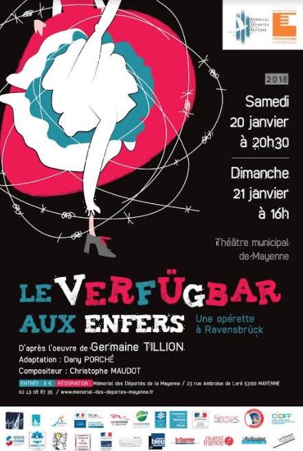 Pour clôturer la programmation « Femmes engagées » débutée en mars 2017, l’association du Mémorial des Déportés de la Mayenne a travaillé depuis plus d’un an, en partenariat avec le conservatoire de Mayenne communauté et l’association mayennaise pour une liaison école-théâtre (AMLET), autour d’un projet ambitieux : la mise en scène du Verfügbar aux enfers – Une opérette à Ravensbrück, d’après l’oeuvre de Germaine TILLION, résistante déportée. Adapté par Dany PORCHE, membre d’AMLET, ce spectacle va réunir sur scène 15 chanteurs/comédiens bénévoles du conservatoire, 4 danseuses bénévoles du conservatoire également et 10 instrumentistes professionnels. Ce projet est varié puisqu’il associe à la fois la danse, le chant et le théâtre.