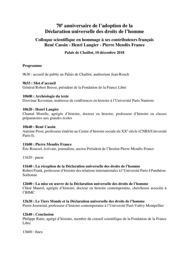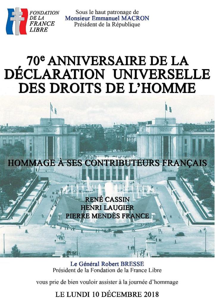 La Fondation de la France Libre organise, lundi 10 décembre 2018, de 9h30 à 13h30, au Musée de l’Homme, auditorium Jean-Rouch, un colloque scientifique consacré aux contributeurs français de la Déclaration universelle des droits de l’Homme – René Cassin, Henri Laugier et Pierre Mendès France –, dans le cadre des commémorations du soixante-dixième anniversaire de l’adoption de ce texte par l’Assemblée générale des Nations Unies, à Paris, au Palais de Chaillot, le 10 décembre 1948.