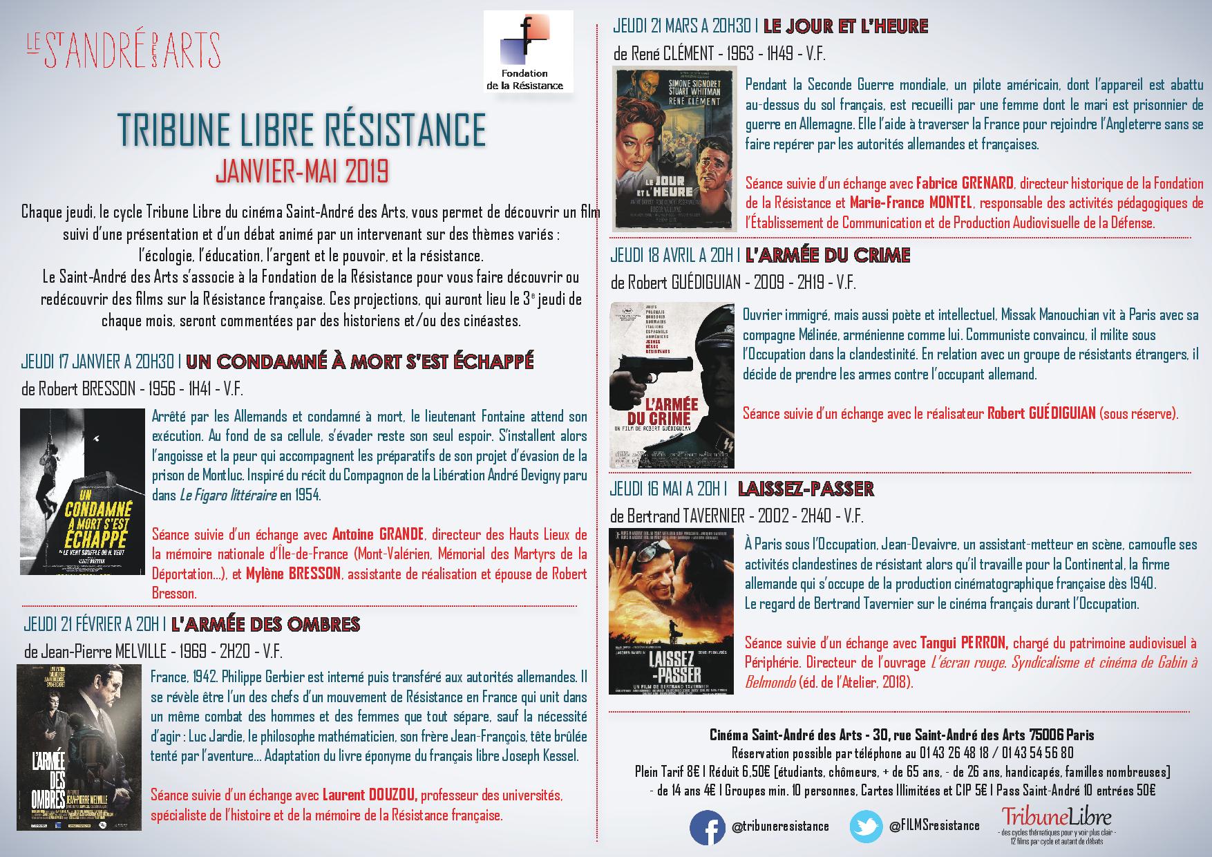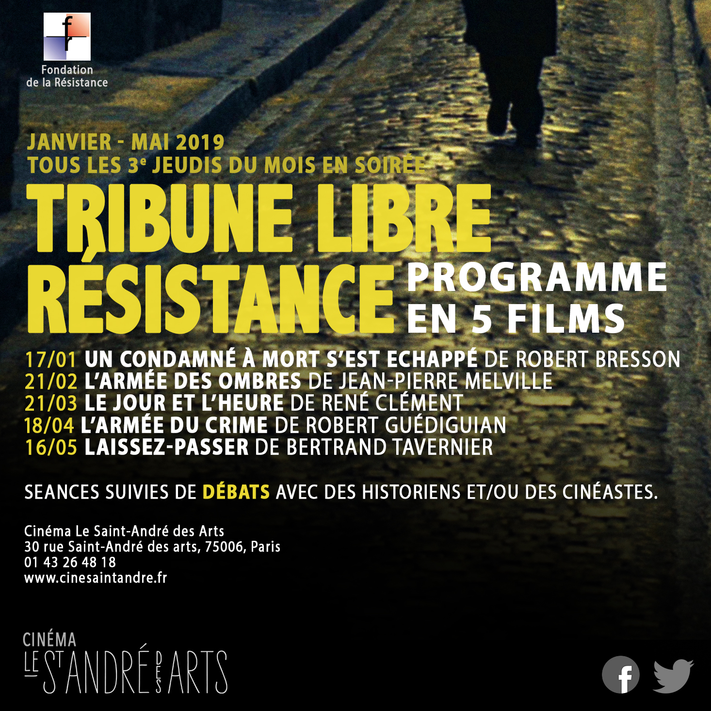 Le cinéma Saint-André des Arts (Paris 6) et la Fondation de la Résistance se sont associés pour organiser un cycle Tribune Libre Résistancede janvier à mai 2019 consacrés à des films sur la Résistance. Le 3eme jeudi de chaque mois, la projection d’un film sur la Résistance sera suivie d’une présentation et d’une discussion avec un historien et/ou un cinéaste (voir programme joint).