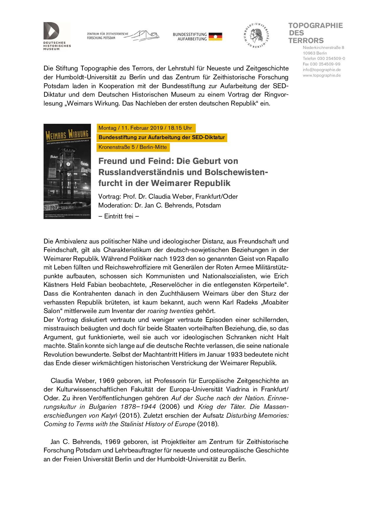 Mo 11. Februar 18.15 Uhr // Bundesstiftung zur Aufarbeitung der SED-Diktatur // Ringvorlesung »Weimars Wirkung. Das Nachleben der ersten deutschen Republik«