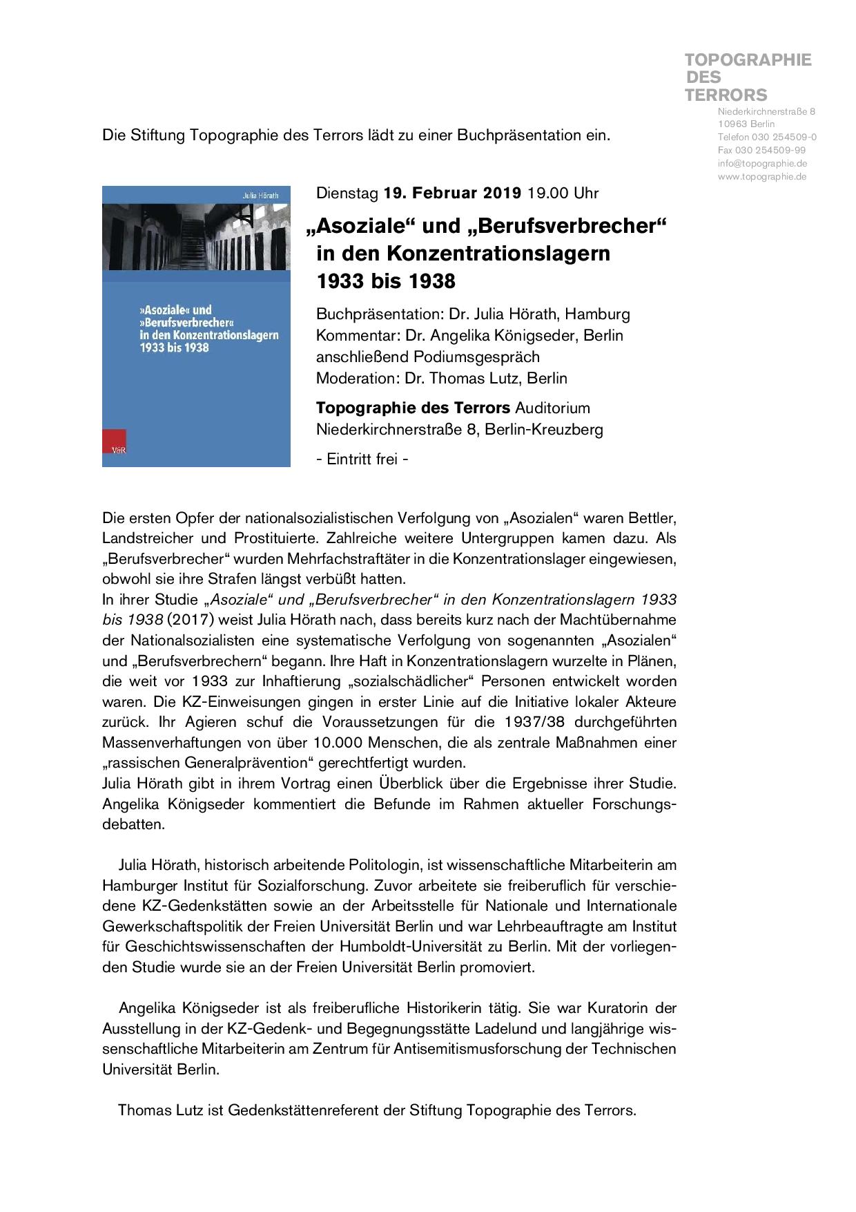 Buchpräsentation: Dr. Julia Hörath, Kommentar: Dr. Angelika Königseder, anschließend Podiumsgespräch, Moderation: Dr. Thomas Lutz