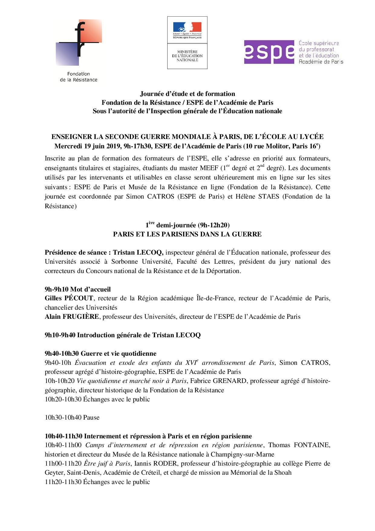 Fondation de la Résistance : Journée d’étude et de formation le 19 juin 2019 à Paris