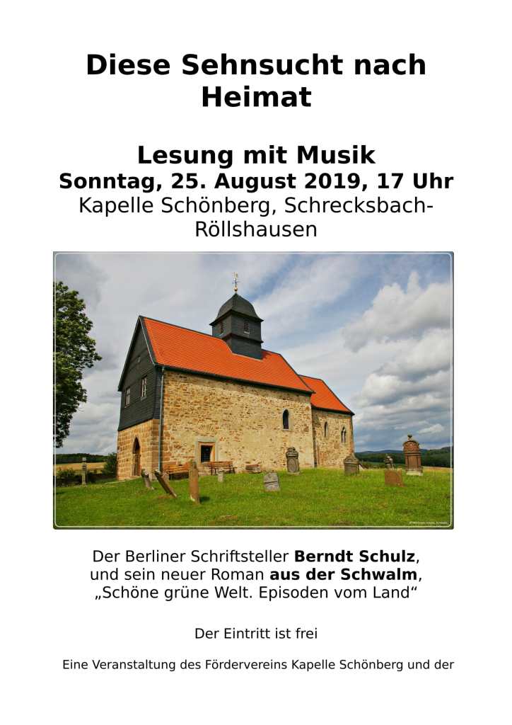 Gerne kommen wir der Bitte nach und leiten die im Anhang angefügte Einladung zur Lesung „Diese Sehnsucht nach Heimat“ in der Kapelle Schönberg an Sie/ Euch weiter.