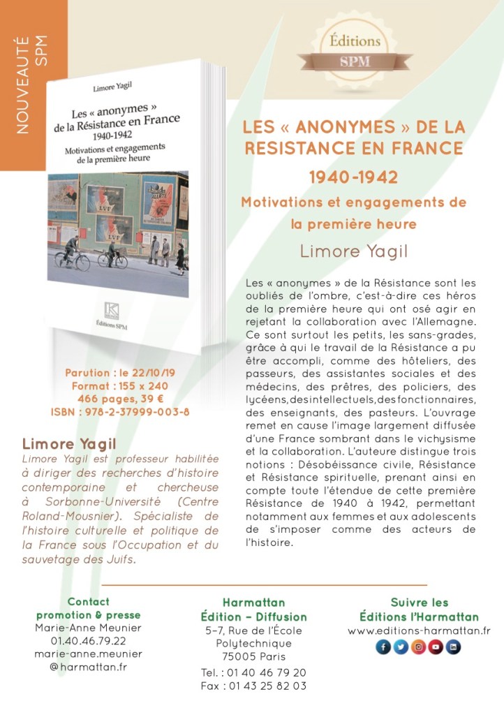 L’historienne Yagil Limore, spécialiste de l’histoire de la Seconde Guerre mondiale, auteure d’une dizaine d’ouvrages sur la période et surtout sur les modalités du sauvetage des Juifs en France, a publié un nouveau livre: Les Anonymes de la résistance en France 1940-1942 s’agit des héros de la première heure qui ont osé en rejetant la collaboration acec l’Allemagne.