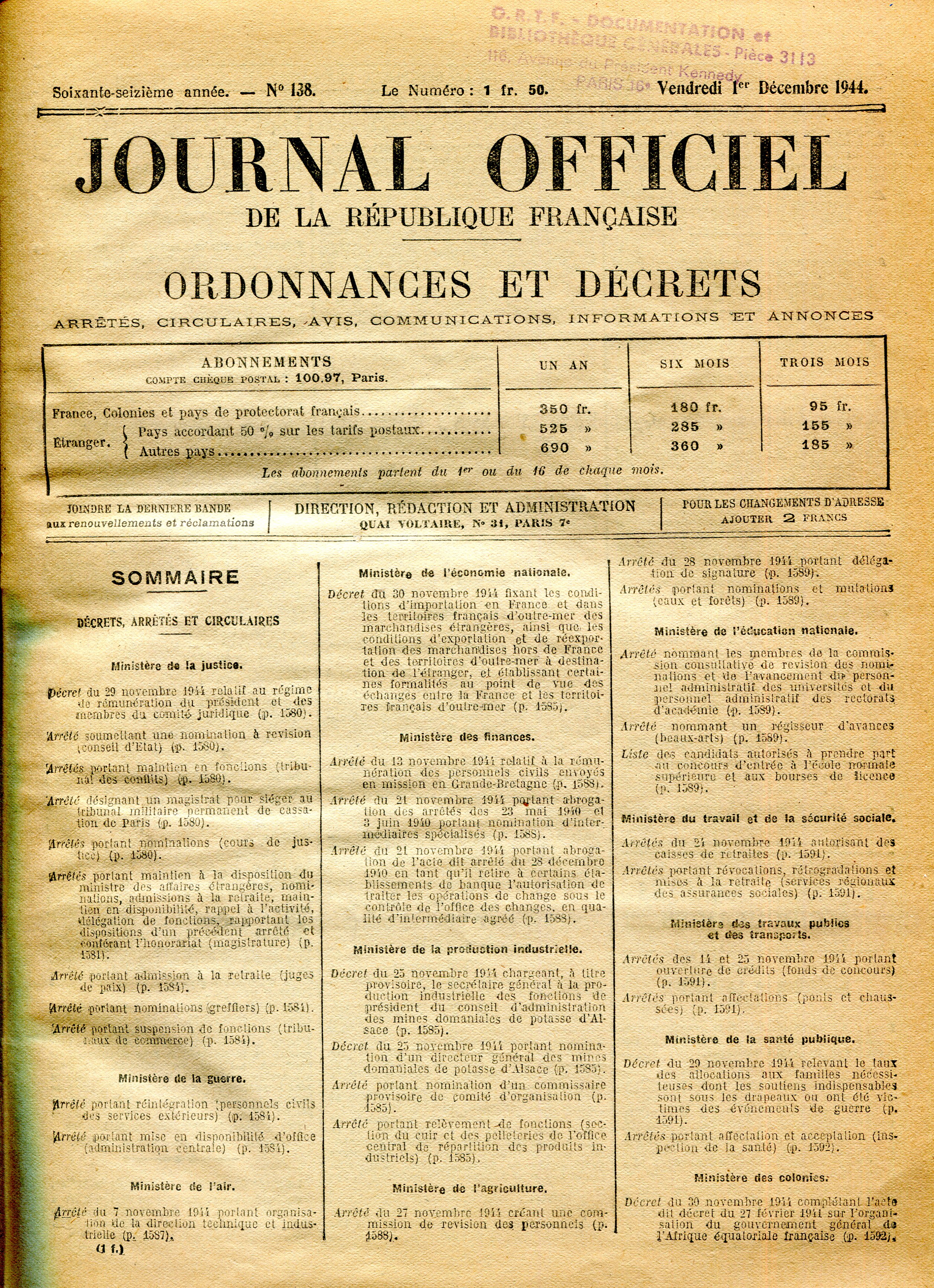 …vous pouvez venir consulter les Journaux Officiels publiés entre janvier 1940 et décembre 1944 (Journal Officiel de la République française, Journal Officiel de l’État français et le Journal Officiel de la République française publié à Alger puis de nouveau à Paris à partir de septembre 1944). L’ensemble compte 57 volumes.