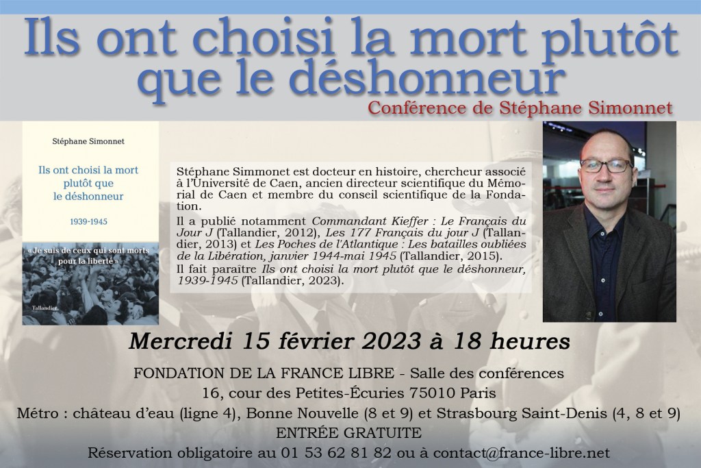 La Fondation de la France Libre reçoit en exclusivité, mercredi 15 février 2023, à 18 heures, Stéphane Simonnet, docteur en histoire et membre de son conseil scientifique, sur le thème de son nouveau livre Ils ont choisi la mort plutôt que le déshonneur, qui paraît demain chez Tallandier. Ce livre revient sur les parcours de 11 personnes : Henri Labit, François Delimal, Berty Albrecht, René-Georges Weill, Fred Scamaroni, Jean Maridor, résistants, agents du BCRA, aviateur, Compagnons de la Libération et Français Libres, Bertrand de Saussine (Marine Vichy), Maurice Bourguignon (commandant du fort de la Ferté), Justin Dutrey (commandant le 40e RANA à Lille), Pierre Wallerand (Commando Kieffer), Maurice de Seynes (Normandie Niémen).