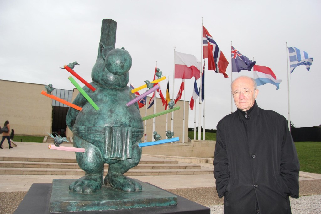 DESCRIPTION : Philippe Geluck et le « Martyre du Chat » au pied de l’esplanade du Mémorial de Caen. Philippe Geluck a installé vingt sculptures monumentales de son Chat à Caen. Le célèbre matou trône même, l’humour en berne, devant le Mémorial.LEGENDE : Geluck et le « Martyre du Chat », devant le Mémorial. Ouest-France