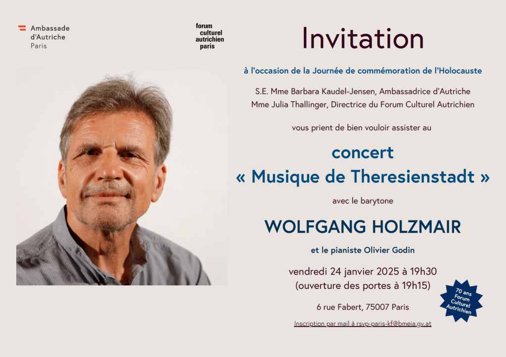 Dans le cadre de la Journée de commémoration de l’Holocauste, un concert intitulé « Musique de Theresienstadt » aura lieu le vendredi 24 janvier 2025 à 19h30 à l’Ambassade d’Autriche, 6 rue Fabert, 75007 Paris.