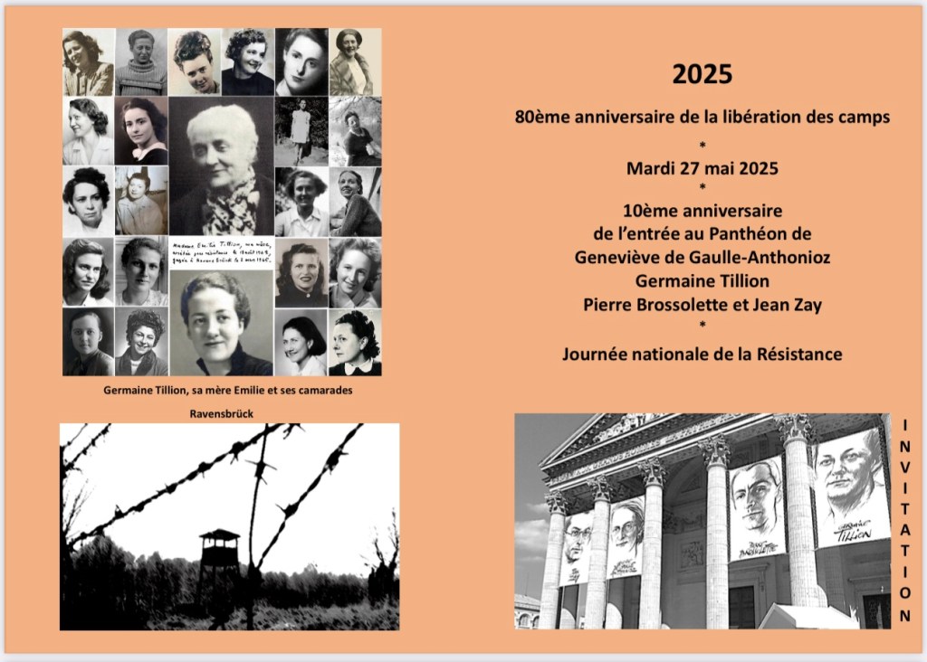 À l’occasion des 80 ans de la libération des camps et des 10 ans de l’entrée au Panthéon de Tillion, de Gaulle-Anthonioz, Brossolette et Zay, l’Association Germaine Tillion vous invite à deux événements le 27 mai à Paris :