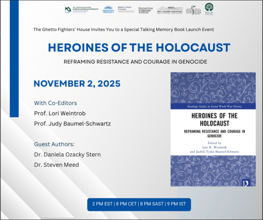 Le Ghetto Fighters’ House organise, le 2 novembre 2025, une rencontre en ligne autour du livre Heroines of the Holocaust: Reframing Resistance and Courage in Genocide. Les coéditrices Lori Weintrob et Judy Baumel-Schwartz, accompagnées des auteurs Daniela Ozacky Stern et Steven Meed, évoqueront la résistance et le courage des femmes pendant la Shoah et d’autres génocides. Ce dialogue intergénérationnel mettra en lumière des récits inspirants de lutte et de transmission.