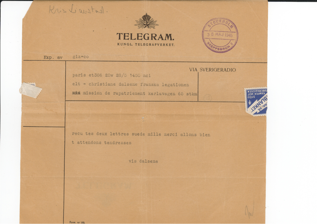 La FMD et les Archives nationales remercient chaleureusement Anne, Corinne et Laure de la Vasselais, filles de Christiane Dalsème, pour ce don d’archives important mettant particulièrement en lumière les échanges, sous forme de courriers et de télégrammes, entre les rescapées des camps soignées en Suède et leur famille demeurant en France.